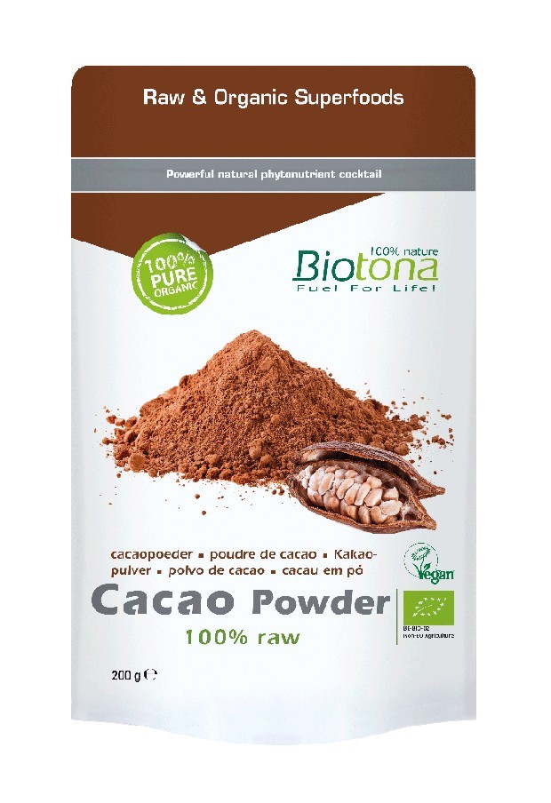 La Poudre de Cacao Bio provient des fèves de Theobroma cacao, un arbre qui pousse sur les sols fertiles des forêts sud-américaines. Le cacao était à l’origine utilisé par les Aztèques et les Mayas lors de cérémonies rituelles. Il fut ensuite introduit en Europe par les colons espagnols. La poudre de cacao raw Biotona est produite à partir de fèves de cacao Arriba 100% biologique en provenance d’arbustes qui poussent en Equateur sur sol volcanique riche en minéraux. La poudre est obtenue par un procédé artisanal de pression à froid à partir de fèves fermentées et séchées au soleil. Ce processus résulte en une poudre de cacao 100% pure, non modifiée, non sucrée et contenant tous ses phytonutriments naturels. Un produit de qualité exceptionnelle, tant sur le plan gustatif que nutritionnel, pour les vrais connaisseurs! poudre de cacao* (Theobroma cacao) (100%) (*culture biologique) Ajoutez la poudre de Cacao Bio à du lait chaud, édulcoré à la stévia, au sirop d’agave ou de riz ou tout autre édulcorant. A essayer aussi en combinaison avec d’autres super-aliments dans un délicieux smoothie ou comme ingrédient dans vos plats et pâtisseries • Conserver au frais, au sec et à l’abri de la lumière. Vendu en paquet de 200 gDescription de la poudre de CACAO