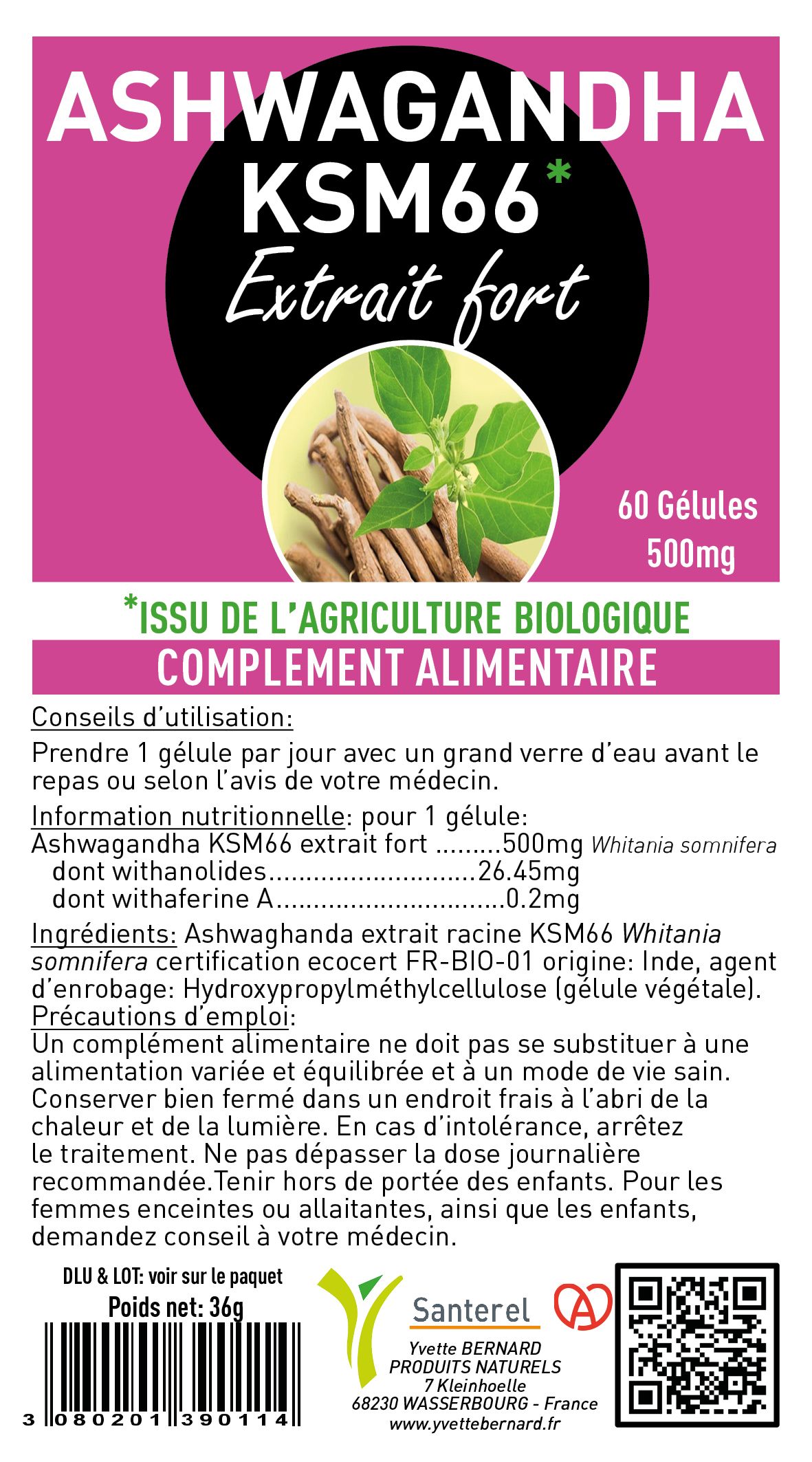 ASHWAGANDHA* extrait fort certifié KSM66 - 60 gelules 500mg - *Issu de l'agriculture biologique - SANTEREL