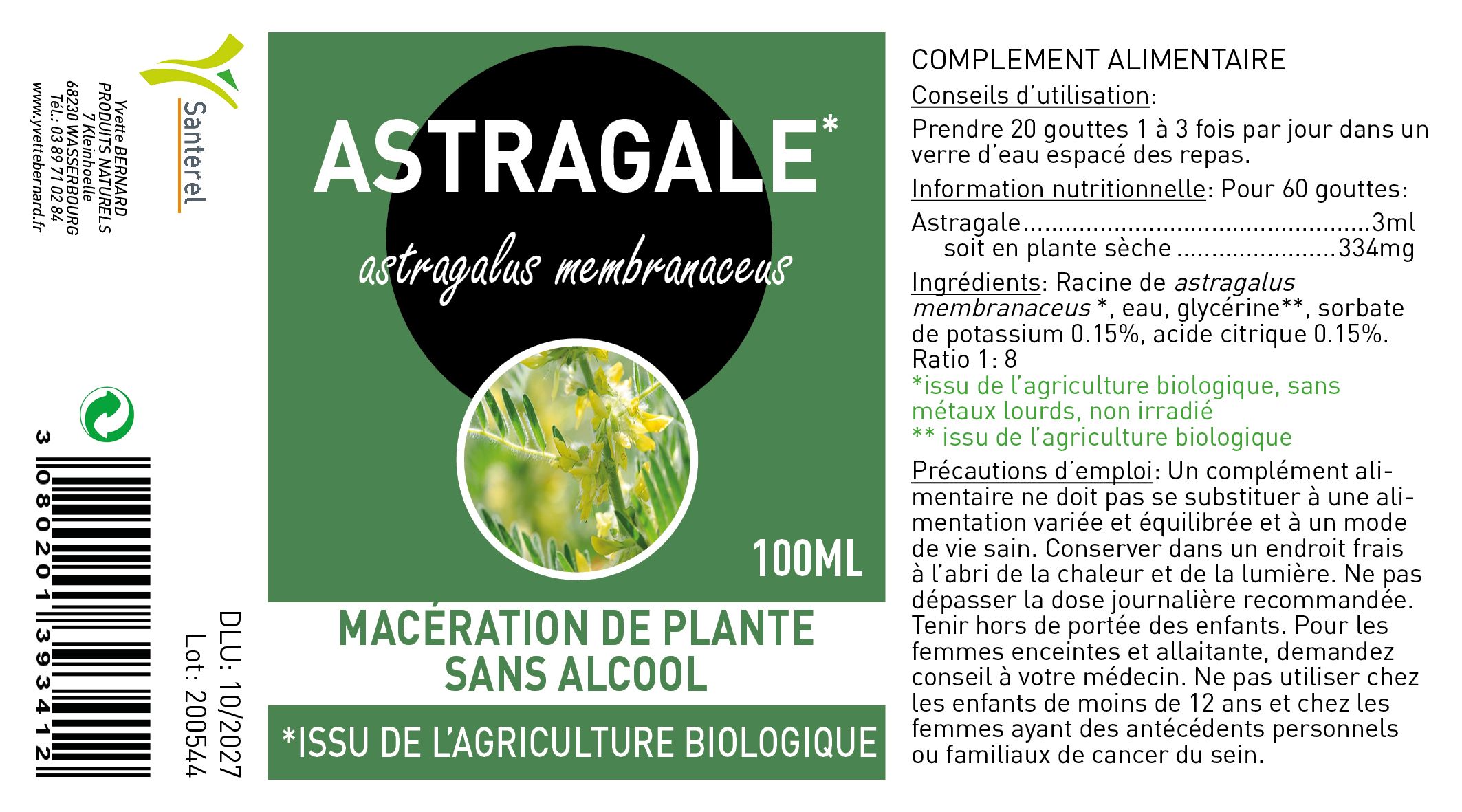 ASTRAGALE* 100ML Macération SANS ALCOOL - Santerel - * Issu de l'agriculture biologique