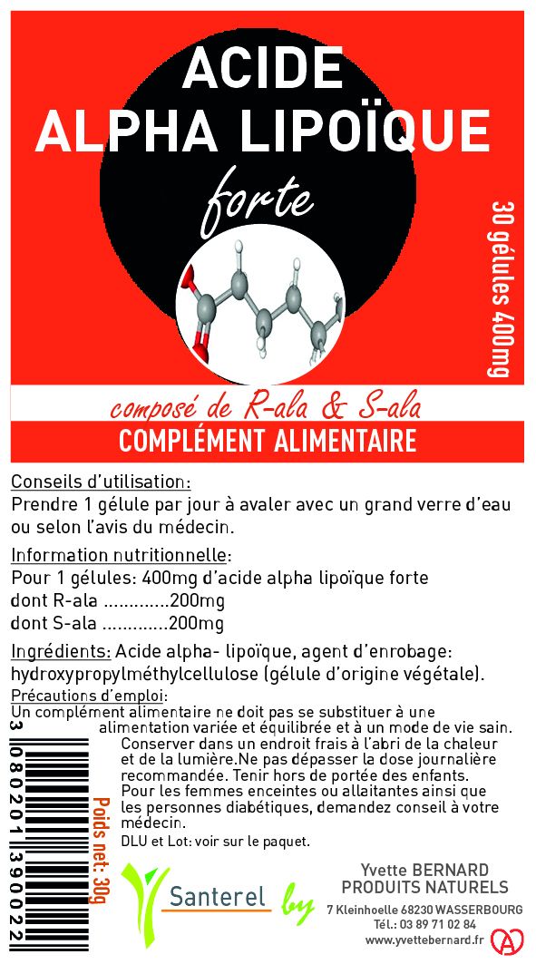 ACIDE ALPHA LIPOIQUE forte (50% R-ALA + 50% S-ALA ) -30 Gélules 400mg - Santerel