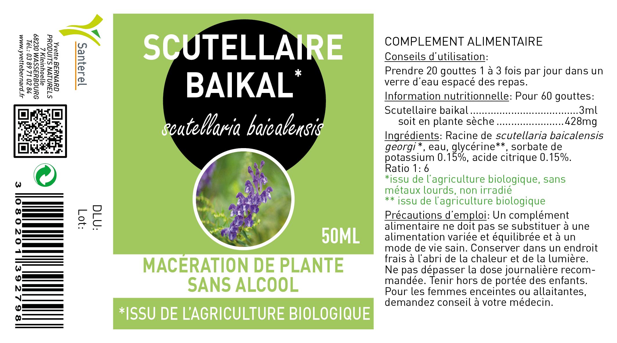 La scutellaire du Baïkal, ou Scutellaria baikalensis, est une plante médicinale aux vertus remarquables, largement reconnue dans la médecine traditionnelle chinoise. Utilisée depuis des siècles, elle est principalement appréciée pour ses propriétés apaisantes et anti-inflammatoires. Nous explorerons en profondeur les bienfaits de la scutellaire baikal, en mettant l'accent sur la macération de la plante sans alcool, ainsi que ses avantages pour la santé .## 1. Origine et historique de la scutellaire baikal La scutellaire du Baïkal est enracinée dans l'histoire de la médecine traditionnelle chinoise, où elle est connue sous le nom de Huang Qin. Cette plante est utilisée depuis des milliers d'années pour traiter divers troubles de santé. Son utilisation remonte à l'Antiquité, où elle était intégrée dans des remèdes à base de plantes pour ses propriétés curatives. La scutellaire est souvent associée à d'autres pratiques de la médecine traditionnelle, telles que l'acupuncture et le massage. Ces méthodes complémentaires renforcent l'efficacité des traitements à base de plantes, créant ainsi un système de soins holistique. La scutellaire du Baïkal est une plante herbacée qui peut atteindre jusqu'à 40 centimètres de hauteur. Elle se distingue par sa tige quadrangulaire et ses fleurs bleu violet, qui fleurissent entre juillet et septembre. La racine de cette plante est la partie la plus précieuse sur le plan médical. La scutellaire baikal est reconnue pour ses puissantes propriétés pour réduire les inflammations. Elle est souvent utilisée pour réduire l'inflammation dans le corps, ce qui en fait un soutien efficace pour diverses affections, telles que l'arthrite et les douleurs musculaires. Cette plante est également célèbre pour son effet calmant sur le système nerveux. Elle est souvent comparée à la valériane, car elle aide à apaiser l'anxiété et à favoriser un sommeil réparateur. Les personnes souffrant de stress ou de troubles du sommeil trouvent souvent un soulagement grâce à la scutellaire. La scutellaire baikal joue un rôle crucial dans le renforcement de nos défenses immunitaire. Elle contribue à aide à combattre les infections et à prévenir les maladies, ce qui en fait un allié précieux pendant les saisons froides. Dans son protocole, Buhner associe la renouée du Japon, la scutellaire baikal, l’andrographis et l’armoise annuelle pour lutter contre les borrelias. La macération de la scutellaire baikal sans alcool permet de préserver les propriétés actives de la plante sans les altérer. Cela garantit que les bienfaits médicinaux sont pleinement exploités, offrant ainsi une alternative saine aux extraits alcoolisés. La macération sans alcool est simple à préparer et à utiliser. Il suffit de mettre les gouttes dans un verre d’eau. Cette solution est particulièrement appréciée par ceux qui souhaitent éviter l'alcool pour des raisons de santé ou de préférence personnelle. Contrairement aux extraits à base d'alcool, la macération sans alcool présente moins d'effets secondaires, ce qui la rend adaptée à un public plus large, y compris les enfants et les femmes enceintes et les animaux. La scutellaire baikal est souvent utilisée pour soulager les troubles digestifs. Elle aide à apaiser les inflammations de l'estomac et à favoriser une digestion saine. Cette plante est également efficace pour atténuer les maux de tête. Grâce à ses propriétés relaxantes, elle aide à réduire la tension et à soulager la douleur. La scutellaire possède des propriétés antiallergiques, ce qui en fait un remède naturel pour ceux qui souffrent d'allergies saisonnières. Elle contribue à aider à stabiliser la circulation sanguine et à réduire les symptômes d'allergies. Avant de commencer un traitement à base de scutellaire baikal, il est conseillé de consulter un professionnel de la santé, surtout si vous souffrez de conditions médicales préexistantes ou si vous prenez d'autres médicaments. Il est important de respecter les dosages recommandés pour éviter tout effet indésirable. Une surconsommation peut entraîner des réactions inattendues. La scutellaire baikal, grâce à ses multiples bienfaits et à sa méthode de macération sans alcool, constitue un choix judicieux pour ceux qui cherchent des solutions naturelles pour améliorer leur santé. Que ce soit pour apaiser le stress, renforcer le système immunitaire ou traiter des troubles digestifs, cette plante offre une multitude d'avantages. En intégrant la scutellaire baikal dans votre routine de bien-être, vous pouvez profiter de ses propriétés thérapeutiques tout en respectant votre santé. Prendre 20 gouttes 1 à 3 fois par jour dans un verre d’eau espacé des repas. Pour 60 gouttes: Scutellaire de lac Baïkal* ..... 428mg (scutellaria baicalensis georgi) *issu de l’agriculture biologique Racine de scutellaria baicalensis* , eau, glycérine*, acide citrique 0.15%, sorbate de potassium 0.15%. Ratio 1:6 * issu de l’agriculture biologique. Un complément alimentaire ne doit pas se substituer à une alimentation variée et équilibrée et à un mode de vie sain. Conserver dans un endroit frais à l’abri de la chaleur et de la lumière. Ne pas dépasser la dose journalière recommandée. Tenir hors de portée des enfants. Pour les femmes enceintes ou allaitantes, demandez conseil à votre médecin. Flacon compte goutte 50ml Existe aussi en 100mlLes bienfaits de la scutellaire baikal HUANG QIN macération de plante sans alcool