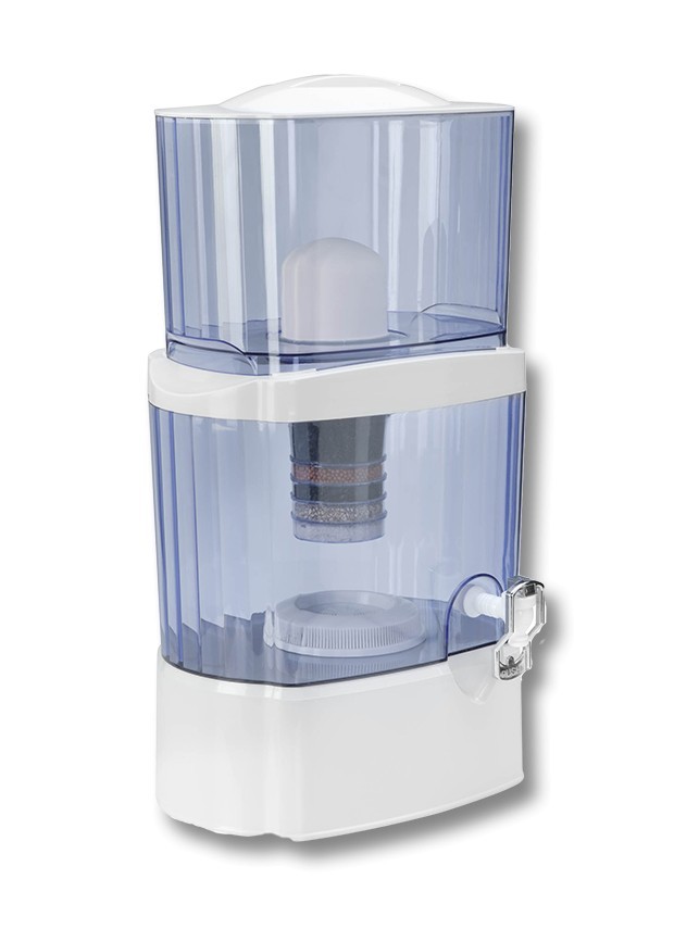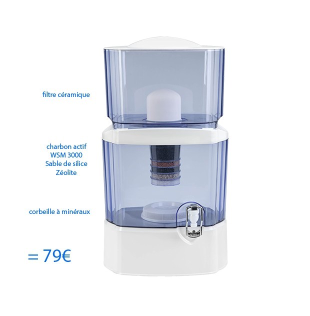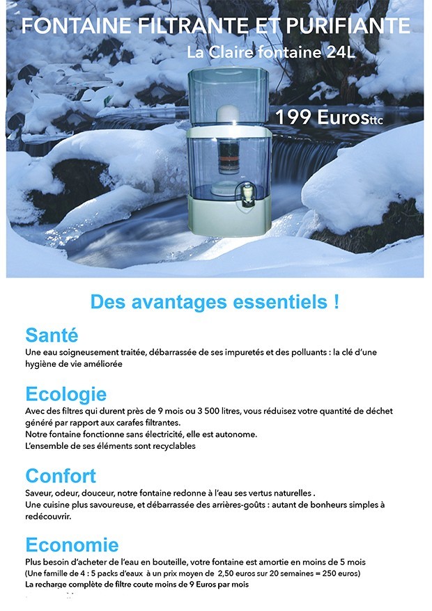Le principe est de filtrer l’eau de votre robinet par différentes étapes en retenant d’abord les éléments potentiellement nocifs présents dans l’eau (sulfates, nitrates, chlore, produits chimiques, pesticides, métaux lourds etc.), puis va ajuster le PH de l’eau grâce à la silice et au quartz (pH qui va se situer au-delà de 7). Le processus se poursuit avec la corbeille minéralisante qui libère un complément minéral riche en oligo-éléments indispensable. A placer dans la cuisine ou dans n’importe quelle autre pièce car la fontaine ne nécessite aucun branchement et est parfaitement autonome. Toute la famille peut se servir à tout moment grâce au robinet. (boisson, cuisine...) Cette fontaine fonctionne sans électricité, elle est autonome. L’ensemble des éléments sont recyclables. La recharge complète de filtre coute moins de 9 euros par mois. Durabilité et longévité des cartouches: 12 mois pour le filtre céramique*, 9 mois pour la cartouche de filtration** et 36 mois pour la corbeille à minéraux***. Après le montage très facile de la CLAIRE FONTAINE, mettre une quantité d'eau suffisante. Au bout d'une heure vous pourrez utiliser l'eau filtrée. Outre une eau filtrée , l’investissement réalisé est extrêmement rentable. Fini les achats de bouteilles d'eau. Plus de transport difficile. La CLAIRE FONTAINE 24L est garantie sans PHTALATE ni BISPHÉNOL A, ou autre substance chimique. Vendu dans une boite en carton bien protégée. LA CLAIRE FONTAINE 24L prêt à fonctionner (avec set inclus) Dimensions : 63 x 34 x 23 cm. Idée de cadeau utile toute l’année et bonne pour la santé familiale! Possibilité de faire un paiement en plusieurs fois.Descriptif de la fontaine filtrante LA CLAIRE FONTAINE 24L